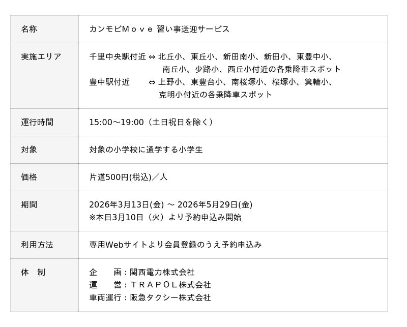 関西電力株式会社(本社:大阪府大阪市北区 取締役代表執行役社長:森 望)は、子育て世帯が抱える習い事送迎の負担軽減を目的として、大阪府豊中市内の一部エリアにおいて、「カンモビMove 習い事送迎サービス」(以下、本実証サービス)の実証を3月13日(金)より開始します。
