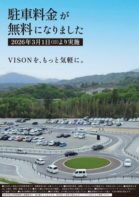 2026年3月1日(日)より、VISON施設内の駐車場を無料でご利用いただけるようになりました。