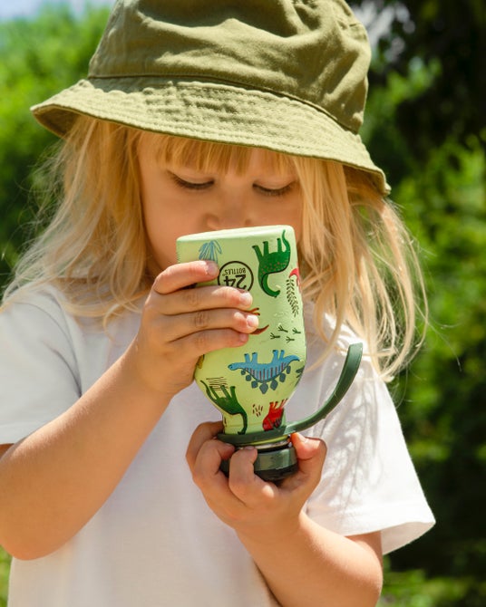 お子様がひとりで簡単に水分補給できる操作性と、24時間の保冷機能を両立。恐竜や動物、野菜などのキャラクターが描かれた個性豊かな6種のデザインで、健やかな成長とサステナブルな習慣をサポートします。