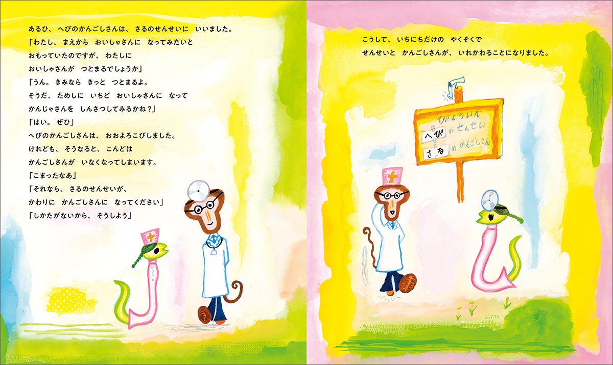 ある日、へびのかんごしさんが「わたし、まえから おいしゃさんに なってみたいと おもっていたのです」と言いだします。そこで、ふたりは一日だけ役割を入れ替えてみることにします。さるのせんせいは「かんごしさん」に、へびのかんごしさんは「せんせい」になって、診察をはじめますが……!?