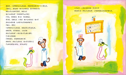 お話の舞台は、どうぶつ村のびょういん。さるのせんせいと、はたらきもののへびのかんごしさんは、奇想天外な治療法で患者さんたちをつぎつぎ元気にしています。
