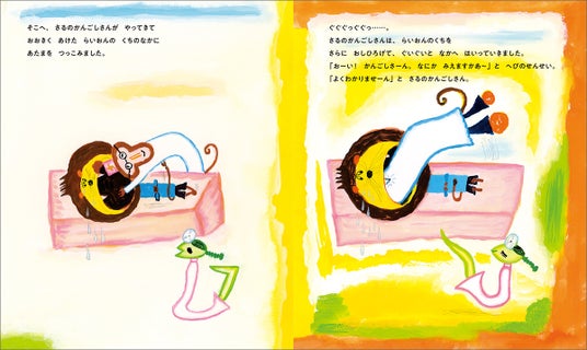 らいおんの患者さんを前に、さるのかんごしさんが大奮闘!?へびのせんせいが見守る中、びょういんは大さわぎに。