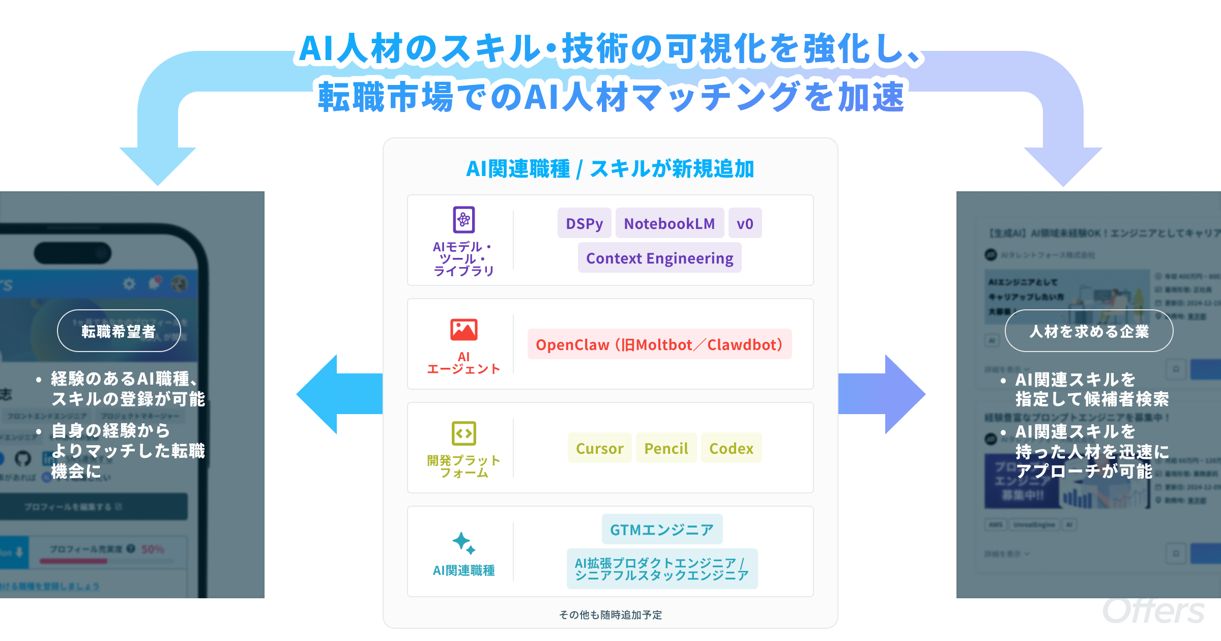 Offersではこうした変化に対応するため、職種・スキルの拡充を継続的に進めてきました。2025年5月にAIスキル登録・可視化機能を提供開始、同年12月にはFDE・AIOps・CAIOなど4職種を追加。今回はその第3弾です。