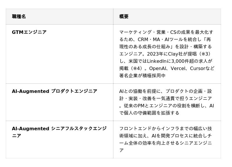 AIコーディングエージェントの普及により、エンジニアの役割は「コードを書く人」から「技術で事業成長に貢献する人」へと変化しています。米国ではこの変化を反映した新職種が次々と生まれ、GTMエンジニアの求人数は前年比205%増(※1)、AI活用を前提としたポジションの採用が加速しています。