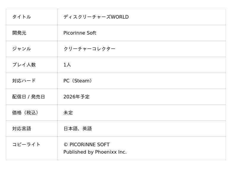 株式会社Phoenixx(フィーニックス)(東京都武蔵野市、代表取締役社長:坂本 和則)は、開発チーム「Picorinne Soft」が手掛ける育成RPG『ディスクリーチャーズWORLD』のパブリッシングを決定いたしました。あわせて、Steamにて本作の「体験版」を公開いたします。