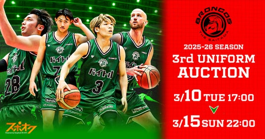 株式会社モバオク(本社:東京都渋谷区、代表取締役社長:小一原 宏樹、以下モバオク)がエンゲート株式会社(本社:東京都中央区、代表取締役:城戸 幸一郎、以下エンゲート)と業務提携し提供するスポーツチーム公式オークションサービス「スポオク」にてB.LEAGUE所属のさいたまブロンコスが実施する『さいたまブロンコス 2025-26 SEASON 3rdユニフォームオークション』を2026年3月10日(火)から開始します。