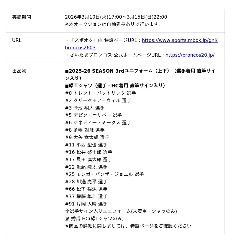 【さいたまブロンコス 2025-26 SEASON 3rdユニフォームオークション 概要】