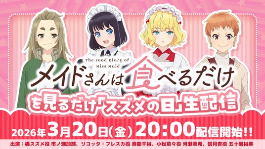 AnimeJapan 2026 dアニメストアブースにて「メイドさんは食べるだけ」スペシャルステージの実施が決定しました!!当日は、橘スズメ役 市ノ瀬加那さん、リコッタ・フレスカ役 須能千裕さんが登壇!! AnimeJapan 2026へお越しの際は、「メイドさんは食べるだけ」スペシャルステージもお見逃しなく!!またステージの様子は、dアニメストア公式YouTubeチャンネルでライブ配信も実施いたします!詳細はdアニメストアの特設ページや公式Xをご確認ください。
