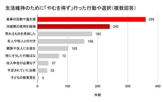 生活維持のために「やむを得ず行った行動」について聞いたところ、「食事の回数や量を減らした」人が359人(約62%)、「冷暖房の使用を極端に我慢した」人が240人(約42%)に上りました。