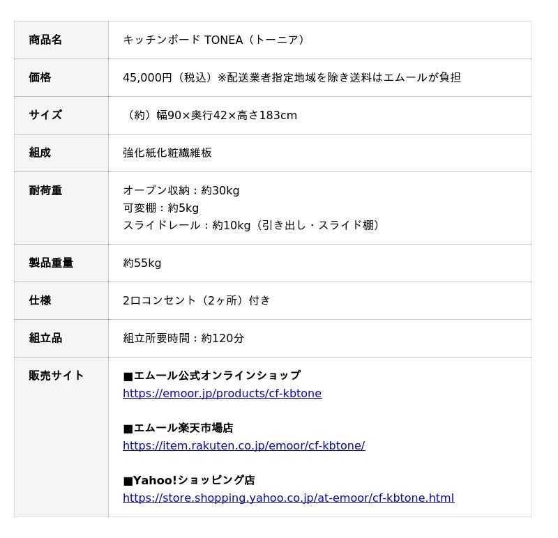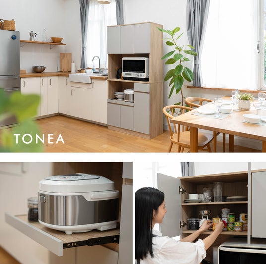 「身体に合った寝る・座る・たたむ」を提供する健康家具ブランドEMOORを展開する株式会社エムール(東京都立川市:代表取締役 高橋 幸司/以下、エムール)は、2026年3月10日よりキッチンボード『TONEA(トーニア)』の販売を開始しました。