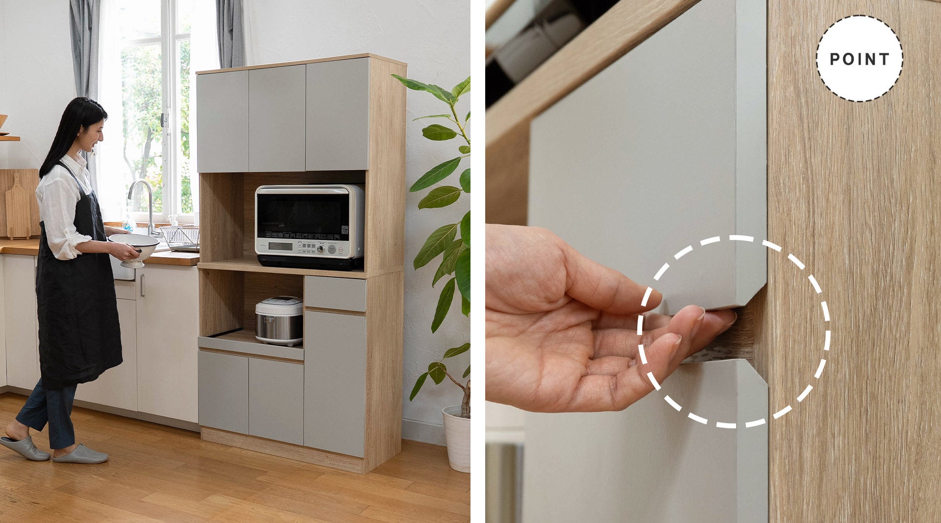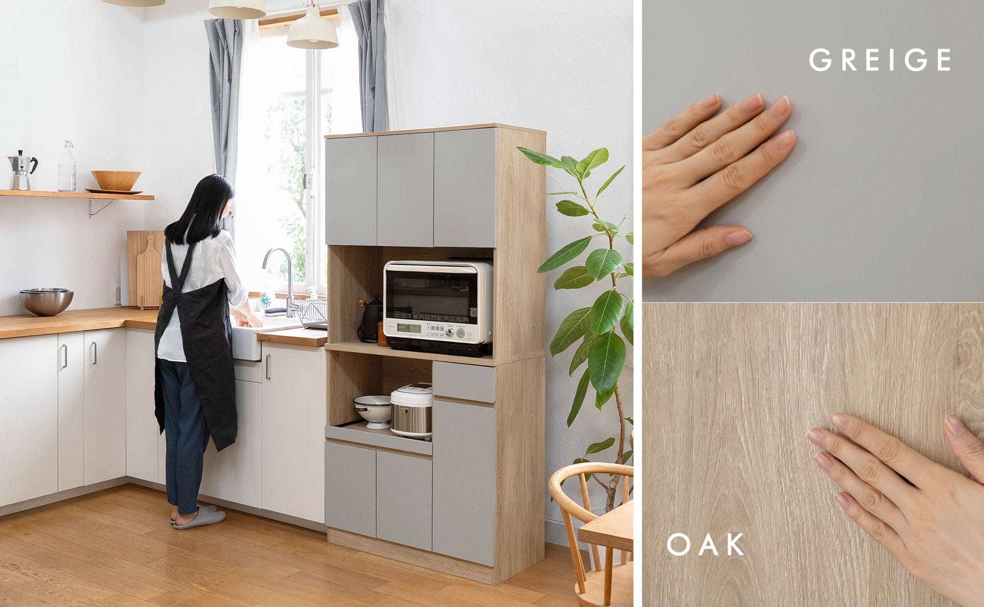 健康家具ブランドEMOOR(エムール)から、中間色のニュアンスグレーと温もりあるオーク木目を組み合わせたジャパンディスタイルの収納家具『TONEA/トーニア』シリーズからキッチンボードが新発売。