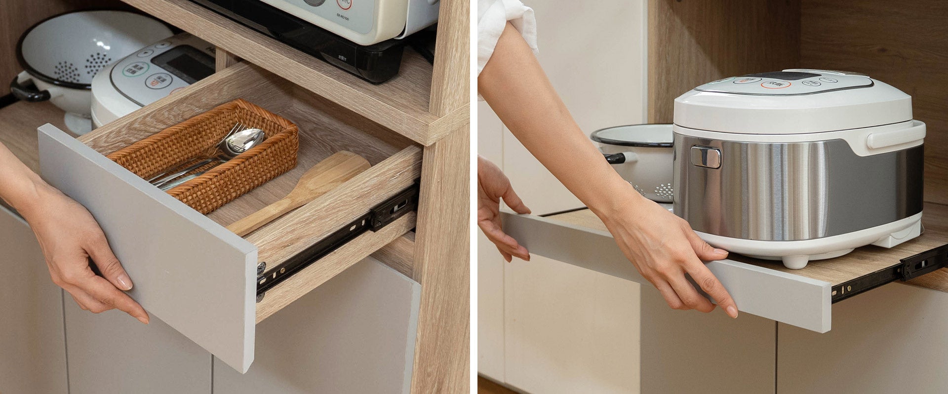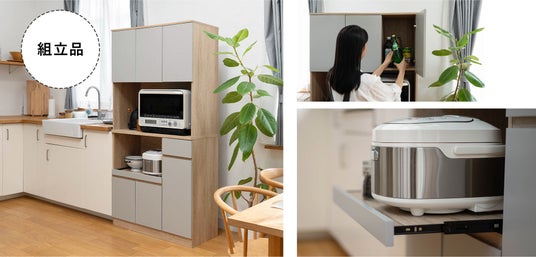 カトラリーやキッチン小物の整理に便利な引き出しにはフルオープンスライドレールを採用。奥の物が一目で確認できるので、取り出しやすい設計です。また、使う時だけ手前に引き出せる便利なスライド棚も装備。フタの開閉が必要な炊飯器や電気ケトルの設置に最適。背面にはこちらも2口コンセントを完備し、家電の使用をしっかりサポートします。