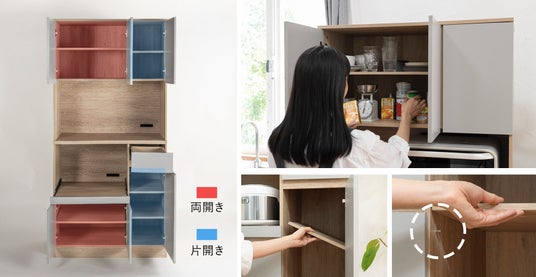 上段・下段に、両開き(大)2か所と、片開き(小)2か所の合計4つの開き戸収納スペースを配置。収納内には、各サイズ共通の可変棚を付属。(大:棚板2枚/小:棚板3枚)収納物の高さに合わせて、効率よく整理できます。