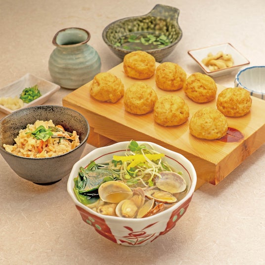 玉子焼と小さなあさりと三陸産わかめうどん 季節の炊き込みご飯セット