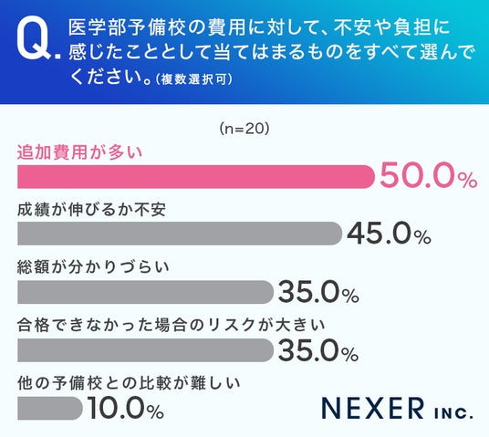 その結果「追加費用が多い」が50%で最も多く、「成績が伸びるか不安」が45%、「総額が分かりづらい」「合格できなかった場合のリスクが大きい」がともに35%となりました。
