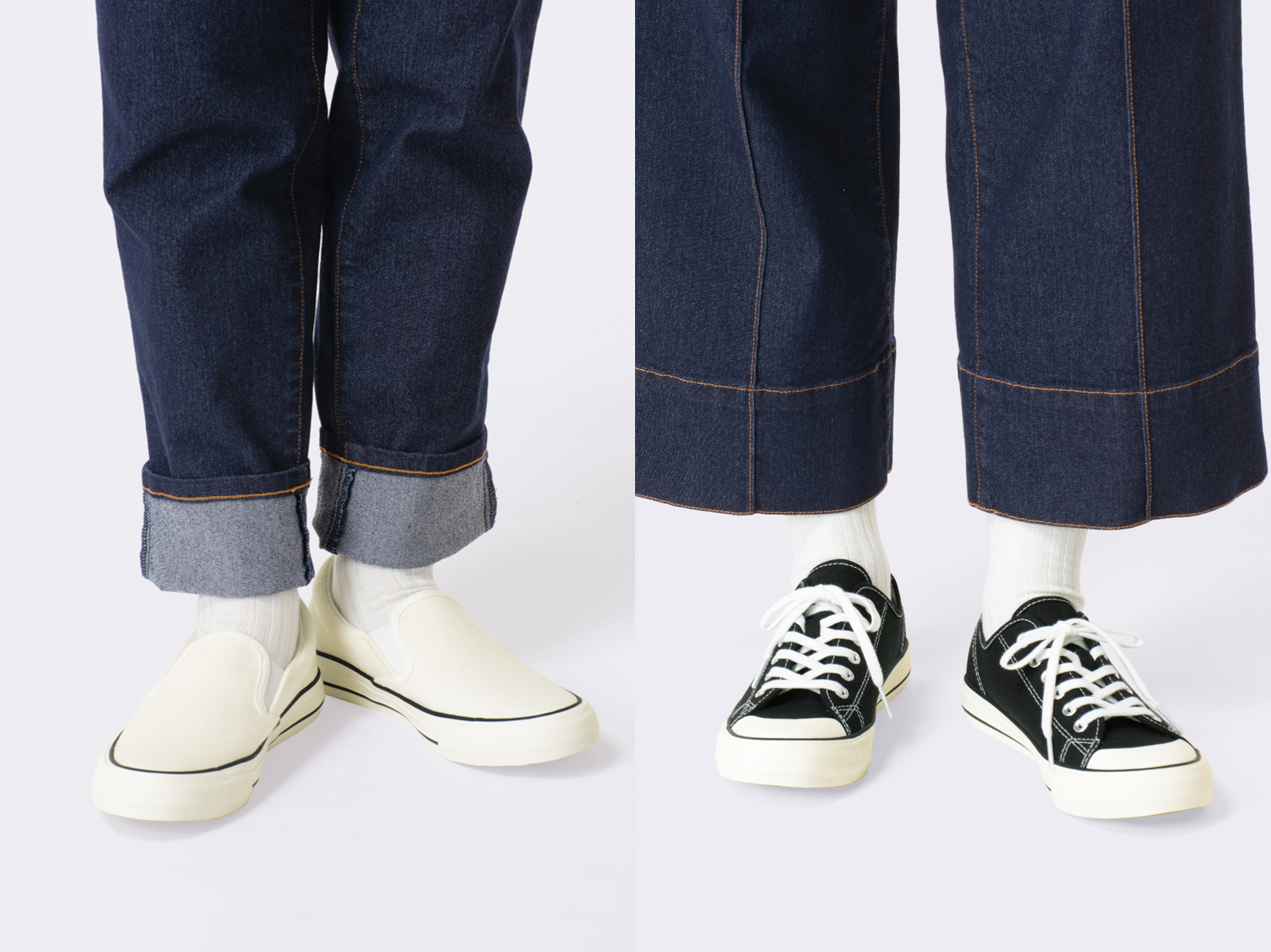 モデル着用カラー:左オフホワイト(スリッポンスニーカー)/右ブラック(レースアップスニーカー)