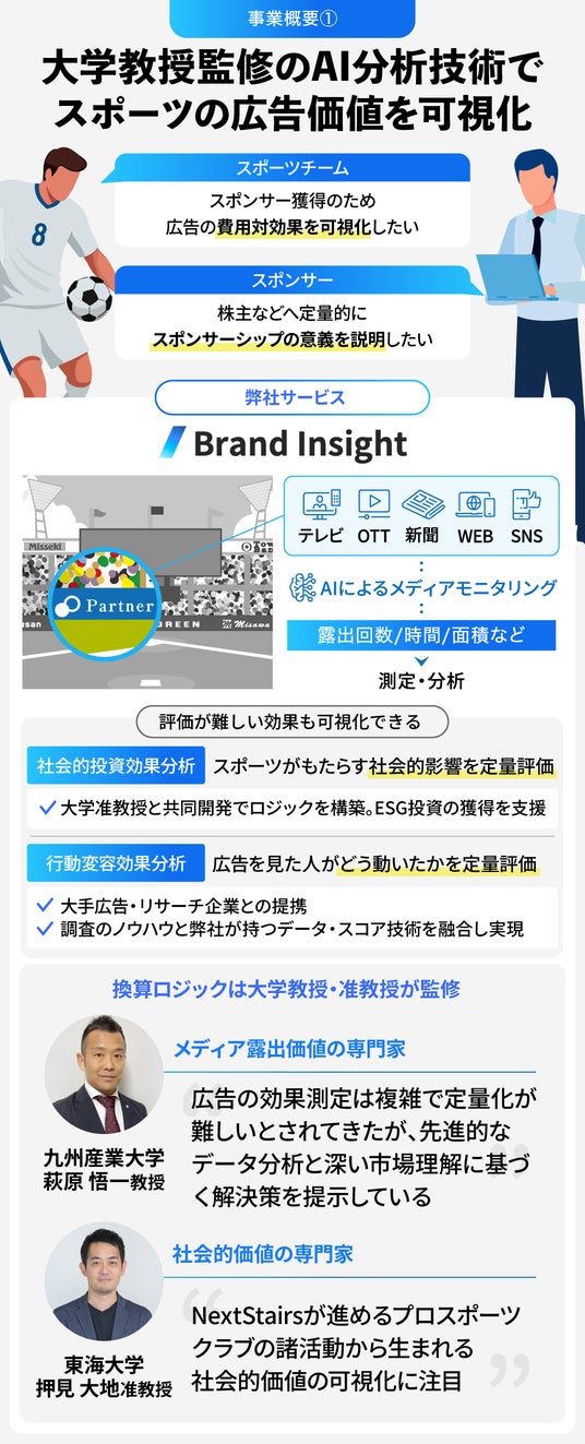 事業概要弊社は、これまでスポーツビジネスにおいてボトルネックとされてきた「スポンサーシップ価値の不透明さ」の解消を目的とする、広告価値換算プラットフォーム「Brand Insight」を展開しています。