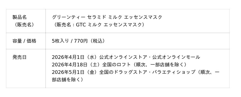 アモーレパシフィックジャパン株式会社(本社:東京都渋谷区)が展開する、自然主義アクティブスキンケアブランド[INNISFREE | イニスフリー] は、ブランドを代表するグリーンティーラインから、インナードライを集中ケアする『グリーンティー セラミド ミルク エッセンスマスク』を、2026年4月1日(水)より公式オンラインストア・公式モールにて、4月18日(土)より全国のロフト(順次、一部店舗を除く)にて、5月1日(金)より全国のドラッグストア・バラエティショップ(順次、一部店舗を除く)にて発売いたします。