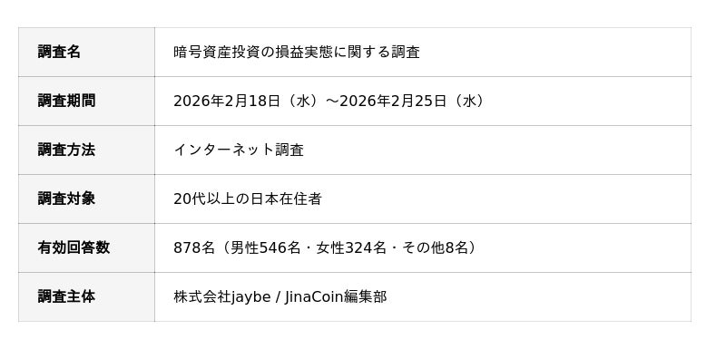 株式会社jaybe(本社:香川県高松市、代表取締役:水澤 誉往)が運営する暗号資産(仮想通貨)ニュースメディア「JinaCoin」(https://jinacoin.ne.jp/)は、20代以上の日本在住者878名を対象に、暗号資産投資の損益実態に関するインターネット調査を実施しました。