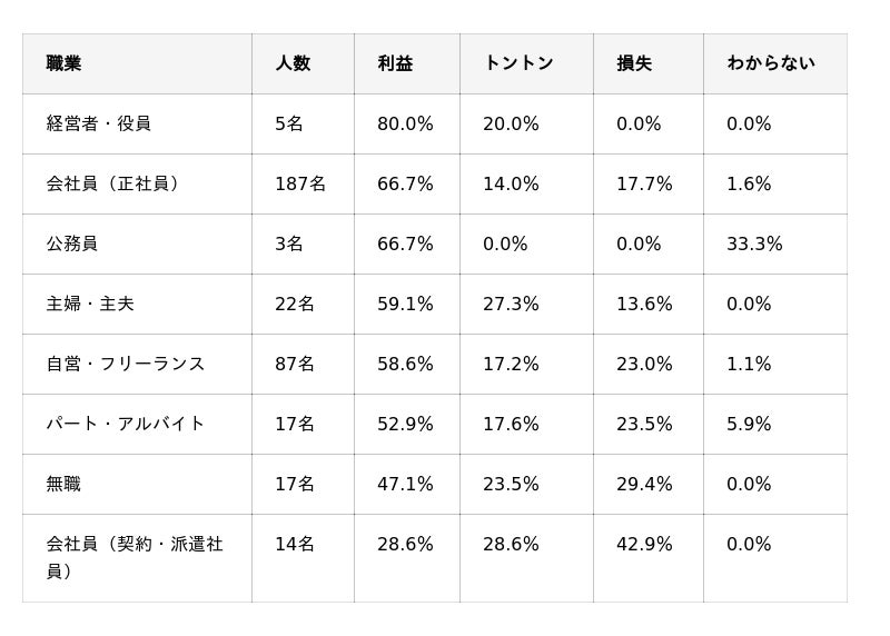 利益を出している人は28.6%にとどまり、損失率42.9%は全職業の中で最も高い結果となりました。サンプル数は14名と限定的ではありますが、雇用形態によって投資成果に違いが生じている可能性も考えられます。