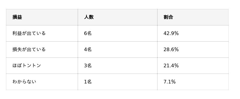 - 会社員(契約・派遣社員)14名のうち42.9%が損失、利益は28.6%