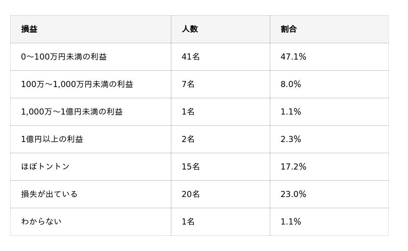 最も多いのは「0~100万円未満の利益」で約半数を占めており、比較的少額から着実に利益を積み上げている層が多い傾向が見られます。
