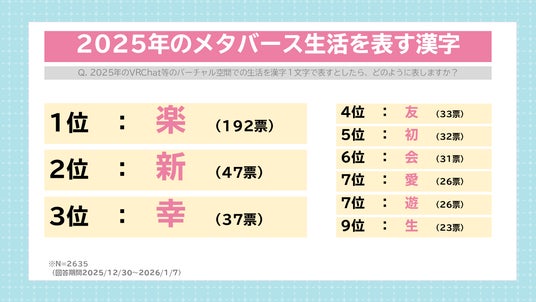 アンケート結果からは、多くのメタバース生活者が「フレンドとの雑談・集まり」を行いながら、年越しをしている様子や、2025年を振り返って「楽」などのポジティブな漢字を思い浮かべる人が多いことがわかりました。