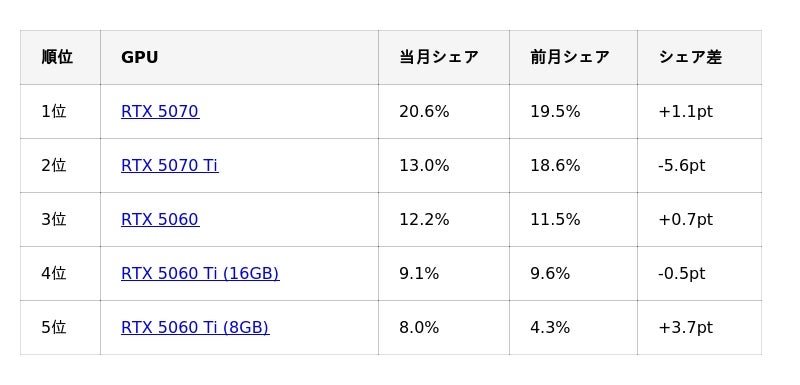 GPU別 市場動向 ― RTX 5060 Ti (8GB)がランキング入り ―