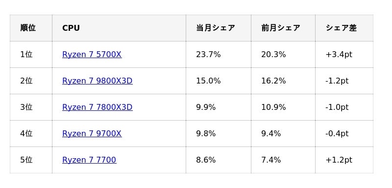 順位は変わらずともX3D系のシェア率が揃って低下していることから、CPU選びにおいても、高性能志向よりコストパフォーマンス重視の検討が強まった月と捉えられます。