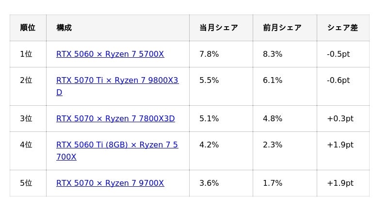 また、前月5位だった「RX 9070 XT」がランキング外に転落し、代わりに「RTX 5060 Ti (8GB)」が食い込んできました。後述する構成別ランキングにも、同様の変化が見られています。