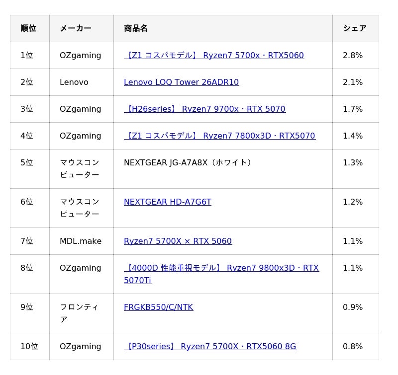 2位、3位の顔ぶれも変わらず、「RTX 5070 Ti × Ryzen 7 9800X3D」のような上位構成も一定の関心を集めています。