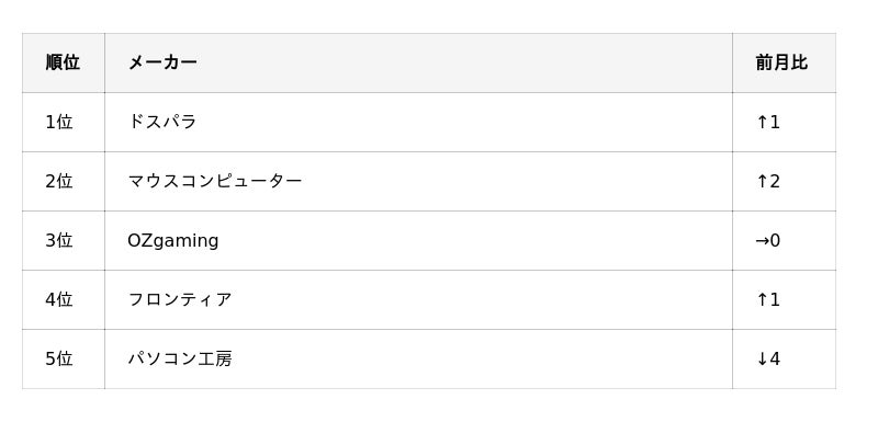 メーカー別のシェア率は、前月2位だった「ドスパラ」が首位に立ちました。