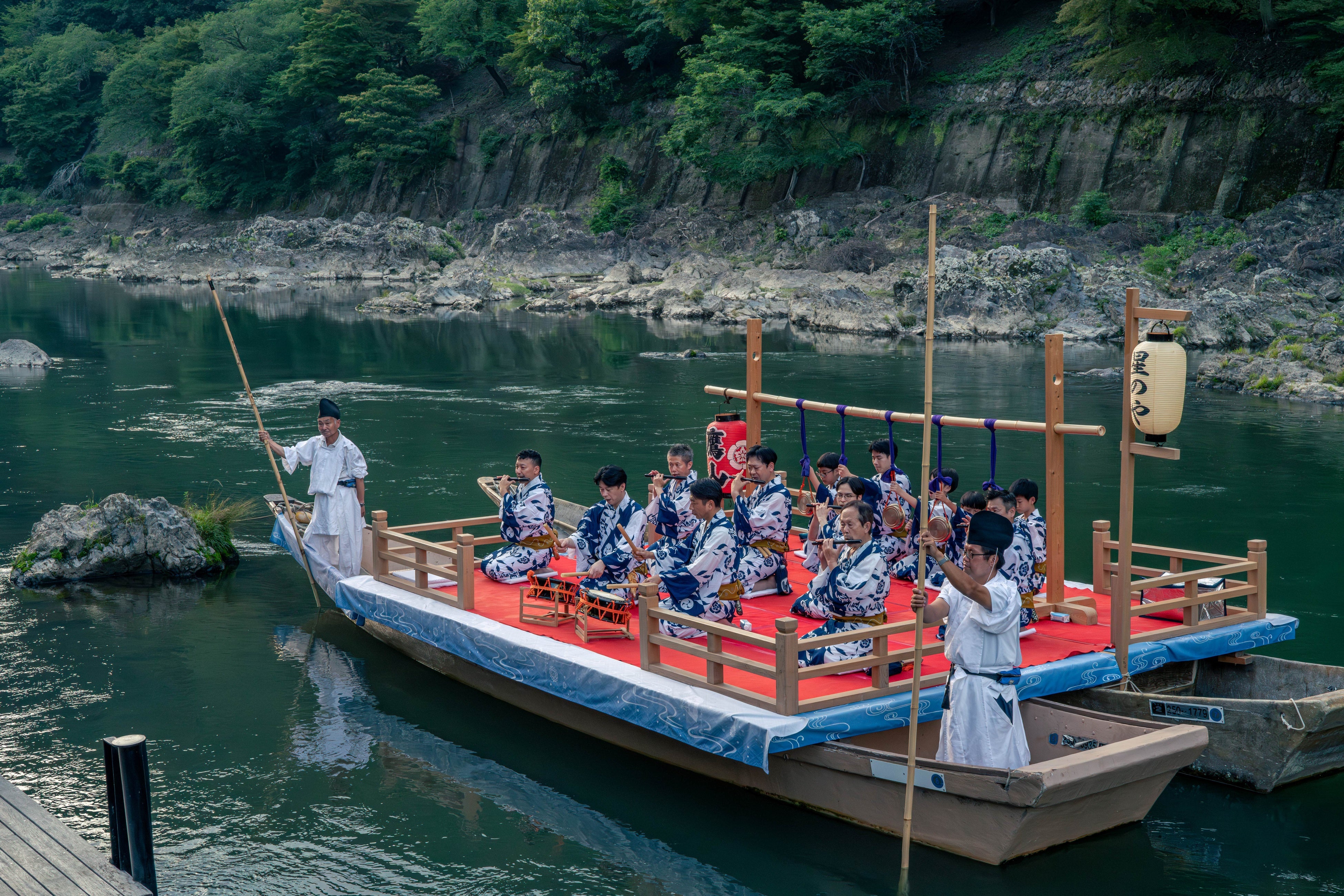 祇園祭の山鉾の一つである「鷹山」を継承する鷹山保存会の方をお招きし、屋形舟にてお囃子を演奏していただきます。鑑賞後は楽器の奏法を教わりながら舟上の囃子方と合奏することも可能です。伝統文化を支える方々と共に音を重ねる一体感を通し、京都の夏の情景に深く没入する、特別な知的好奇心を満たすことができます。