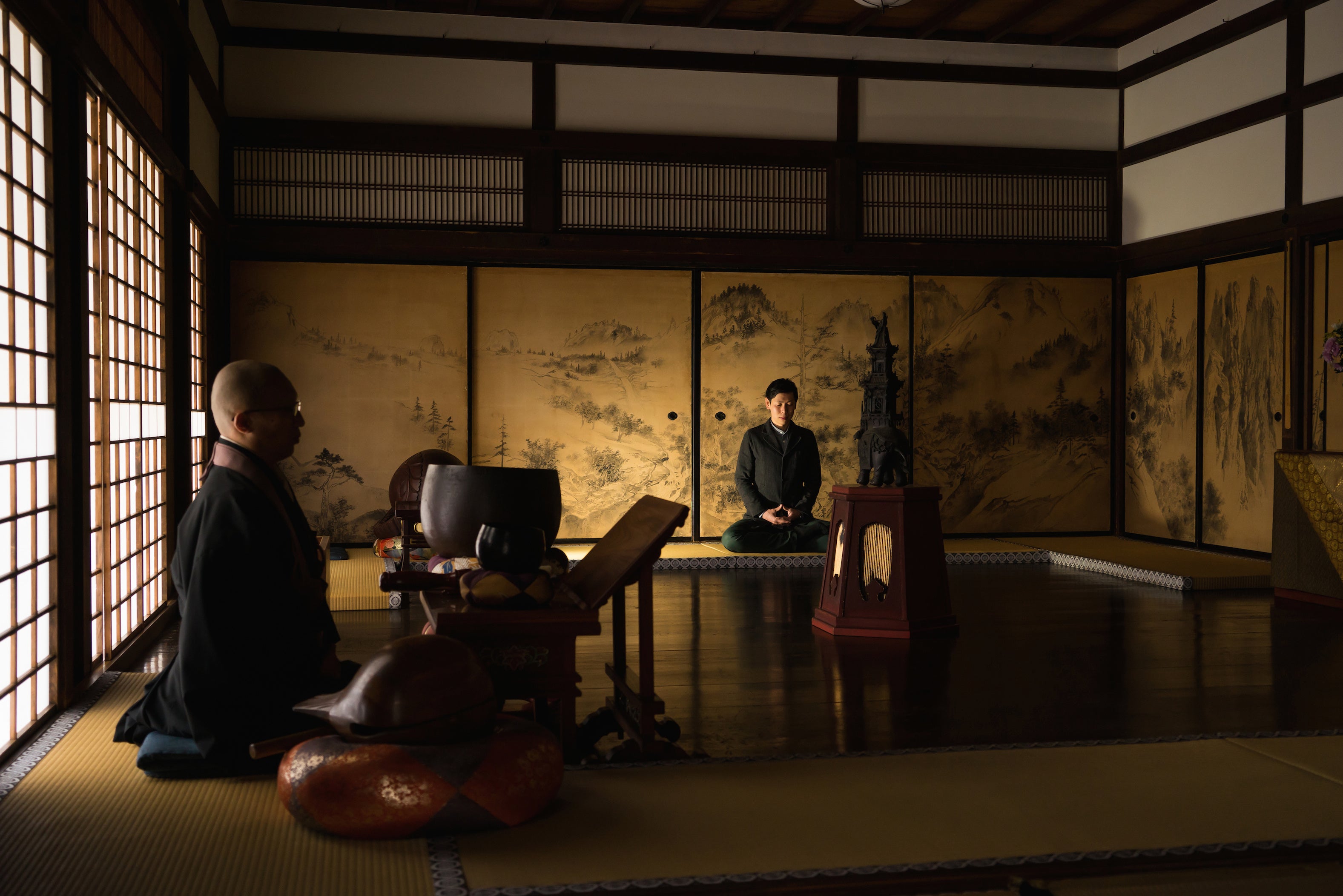 大徳寺瑞峰院にて、早朝の凛とした空気の中、読経と座禅を行う「朝のお勤め」を体験できます。体験の後は、お抹茶をいただきながらご住職の説法を聞いて、禅の心に触れます。
