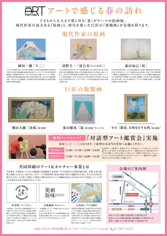 共同印刷株式会社(本社:東京都文京区、代表取締役社長:大橋輝臣 以下:当社)は、本社TOMOWELホールにて、「TOMOWEL ART FESTIVAL ~アートで感じる春の訪れ~」と題した絵画の展覧会を開催します。