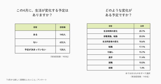 【アンケート結果要約】- この4月に、「生活が変化する予定がある」と回答した人は、140人で回答者全体の15.6%にのぼった