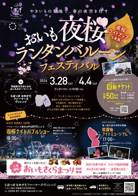やきいもの聖地として知られる体験型農業テーマパーク「らぽっぽ なめがたファーマーズヴィレッジ」にて夜桜と ランタンが春の夜空を彩るイベント「おいも夜桜ランタンバルーンフェスティバル」を開催します。 イベントの目玉は、願いごとを書いたLEDランタンバルーンを夜空に放つランタンバルーンリリース。火を使わない 安全なランタンが春の夜空を幻想的に彩ります。会場では、やきいも食べ比べやおいもスイーツ詰め放題、ほくほく グルメ、お花見ライブ、ナイトミュージアムなど、朝から夜まで楽しめる“おいも×桜”の春イベントを展開します。