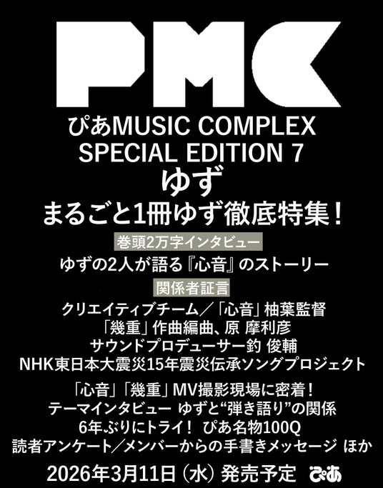 ぴあ株式会社発行の音楽誌『ぴあMUSIC COMPLEX(PMC)』より、まるごと1冊ゆずを大特集した特別編集本『ぴあMUSIC COMPLEX(PMC) SPECIAL EDITION 7 ゆず』が本日、3月11日(水)に発売。