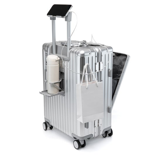 本製品は、圧倒的な堅牢さと重厚感を備えるフルアルミニウムボディを採用しながら、従来のアルミ製スーツケースでは構造制約から難しかった多機能装備(フロントオープン、USB充電ポート、ドリンクホルダー、スマホスタンド)を実現しました。