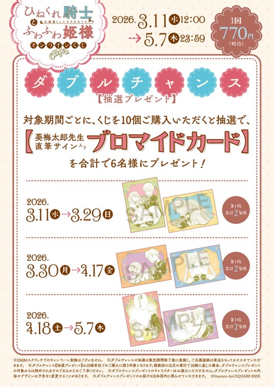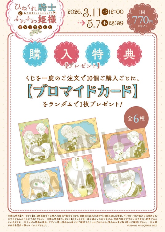 本日2026年3月11日正午より、スクウェア・エニックス e-STORE、DMMスクラッチにて『ひねくれ騎士とふわふわ姫様 古城暮らしと小さなおうち』(葵梅太郎先生)のオンラインくじの予約受付が開始いたしました。