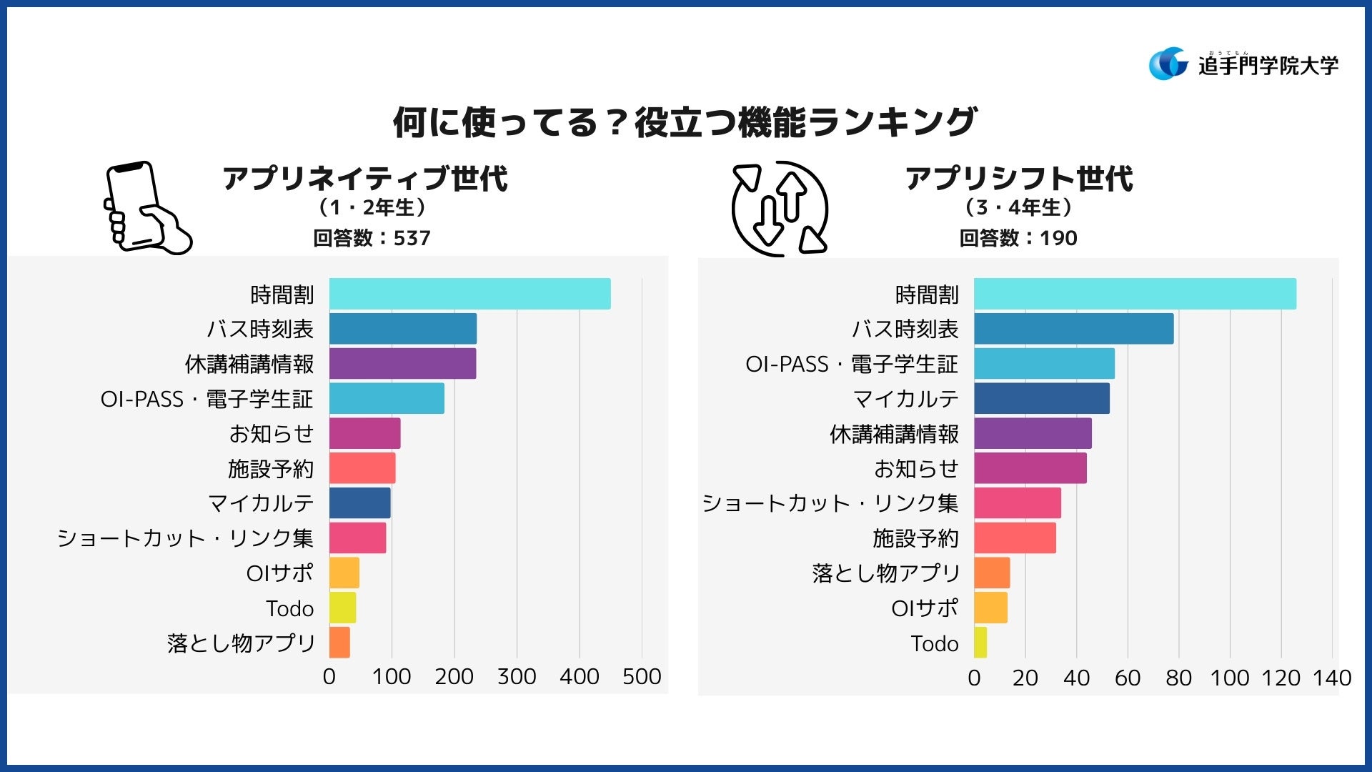今回の調査では、入学時から本アプリが導入されている「アプリネイティブ世代(1、2年生)」と、在学中に導入された「アプリシフト世代(3、4年生)」における、世代間の利用実態や評価の違いも分析しました。回答者の内訳は、1年生336人(46.1%)、2年生203人(27.8%)、3年生147人(20.2%)、4年生43人(5.9%)となっています。