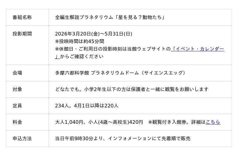 多摩六都科学館(東京都西東京市、館長:高柳雄一。以下、当館)では2026年3月20日(金)から5月31日(日)まで、全編生解説プラネタリウム「星を見る?動物たち」を投影します。