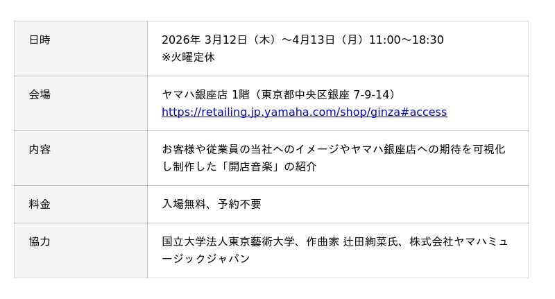 ヤマハ株式会社(以下、当社)は、当社独自の感性計測技術を用いて、国立大学法人東京藝術大学、作曲家の辻田絢菜氏、株式会社ヤマハミュージックジャパンと協働し、当社ブランドを体現する「開店音楽」を制作しました。その制作ストーリーを紹介する特別展示「新しい開店音楽の秘密」を2026年3月12日(木)から4月13日(月)までヤマハ銀座店 1階で開催します。