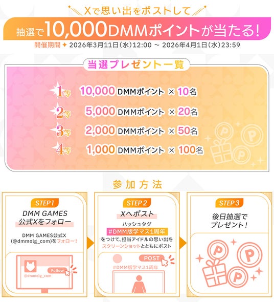 Xのハッシュタグキャンペーンを実施中です。#DMM版学マス1周年をつけて、担当アイドルの思い出とともにスクリーンショットを添付してポストした方の中から、抽選で最大10,000DMMポイントが当たります!ぜひ、『学マス』の思い出を語ってください♪