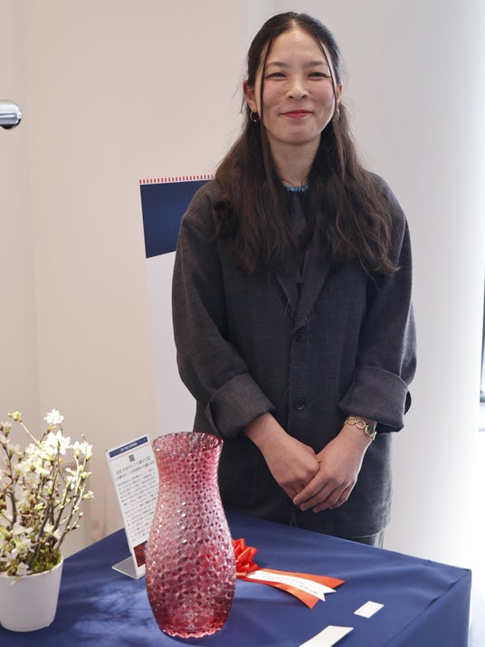 2025年新作展で1位「経済産業省大臣官房商務・サービス審議官賞」を受賞した「朧」と、伝統工芸士・山田のゆりさん。