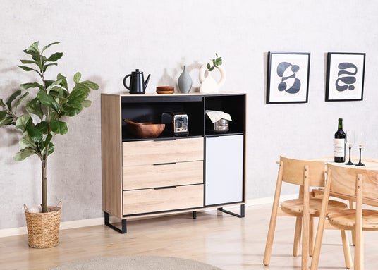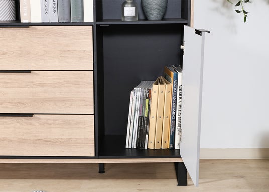 “見せる”と“隠す”を両立するキャビネット。開放部には雑貨・本・アートを飾り、個性と季節感をプラス。置くだけで空間の印象が変わります。