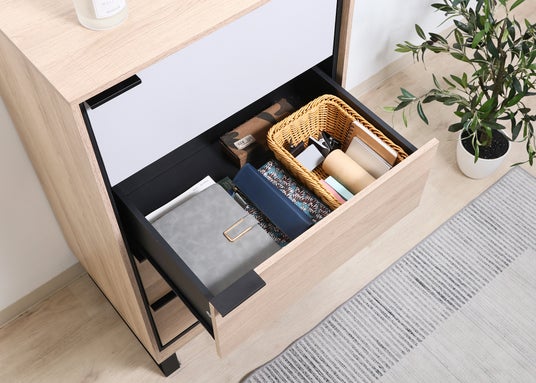 4段の引き出しには、リビング小物や衣類などをたっぷり収納。開閉がなめらかなスライドレール仕様で、奥までしっかり引き出せます。