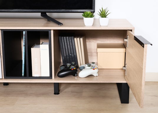 引き出し2杯+左右扉収納で、リモコン類/DVD/ゲーム機など雑多になりやすい小物をすっきり整理。見せたくないものは隠しリビングを端正に。