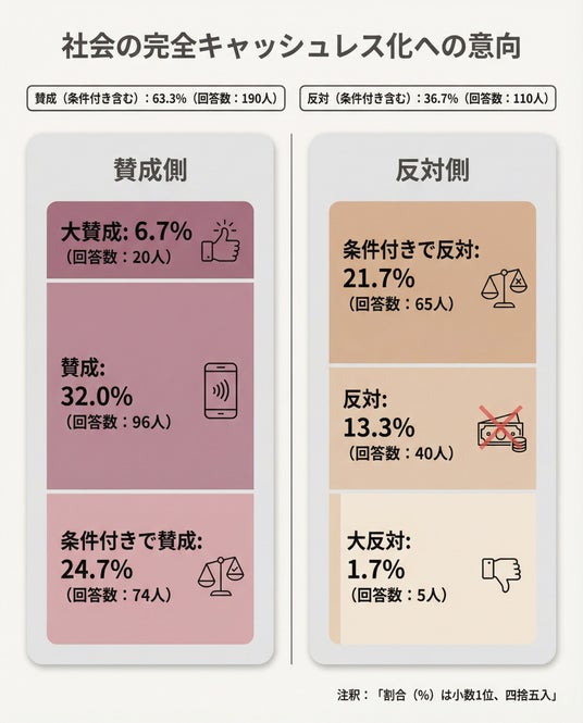 ・社会の完全キャッシュレス化は賛成(条件付き含む)63.3%(190人)、反対(条件付き含む)36.7%(110人)
