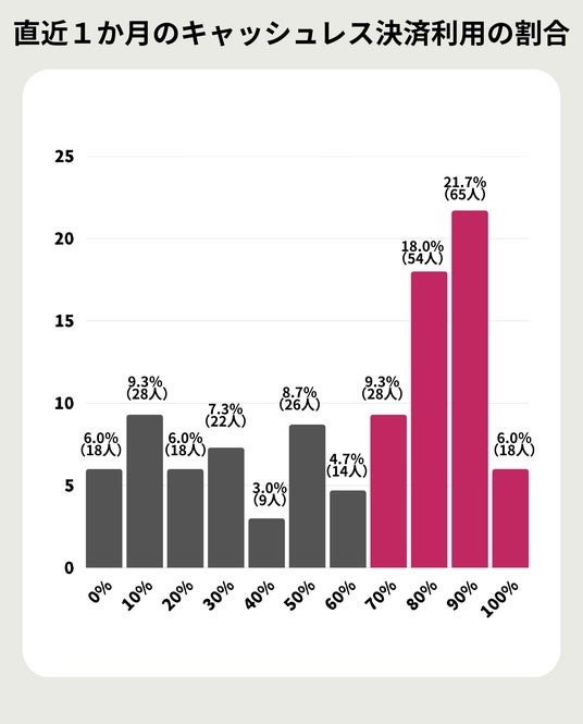 一方で100%は6.0%(18人)にとどまり、支払いをすべてキャッシュレスにしている人は少数派でした。